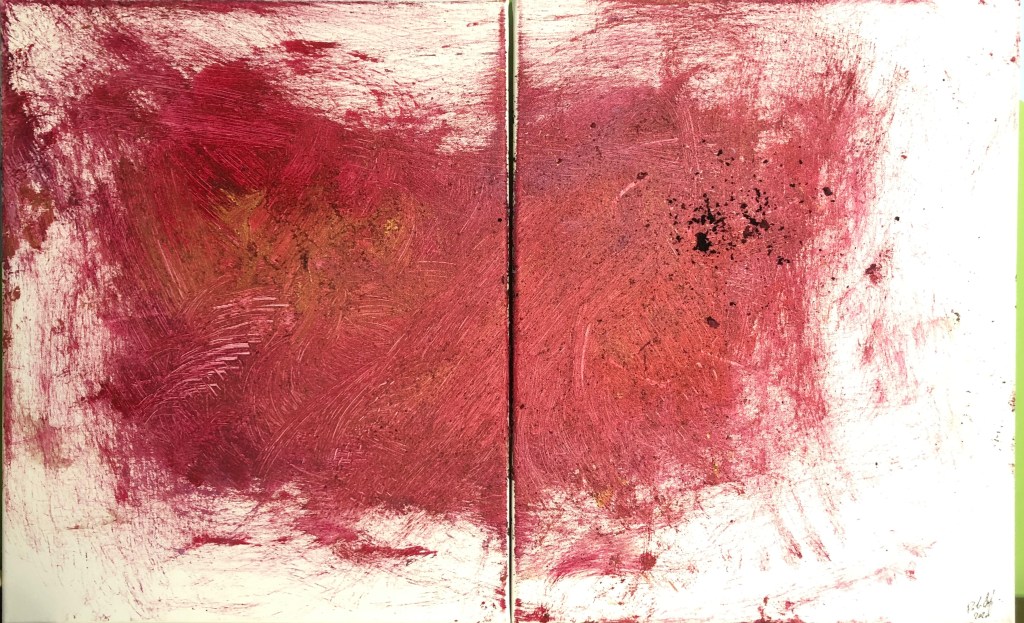 Questa tela è stata realizzata durante una diretta su Instagram/Facebook. Ho utilizzato preparati vinilici con pigmenti, ocra e rosso e il colore oro e qualche spolverata di polvere di caffè. La scelta dei colori è stata casuale, essendo bendato non sapevo cosa stessi usando. Ho fatto questo esercizio partendo dal Setting terapeutico, usato in Arte terapia. L’esercizio si sviluppa in 3 fasi: