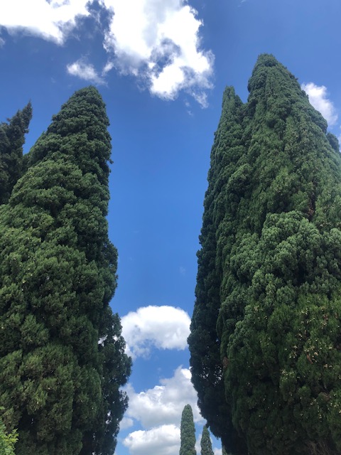 La maestosità di questo albero mi fa pensare a un pennello, che dipinge il cielo: le emozioni tristi vengono sfumate dal tocco dell’artista, sotto il cielo maestoso. Guardandoli tutti insieme sembrano dita di una mano, che vogliono toccare il cielo, il cipresso è il simbolo dei cimiteri, le loro radici entrano verticali nel cuore della terra, così facendo non alzano le tombe, non disturbano la quiete dei non viventi.