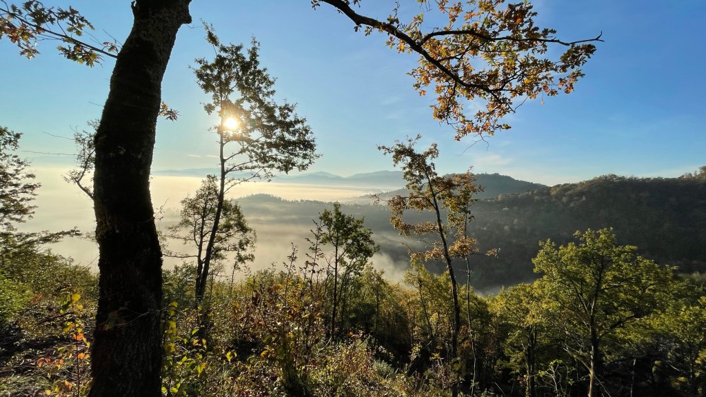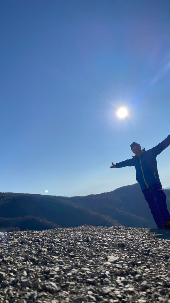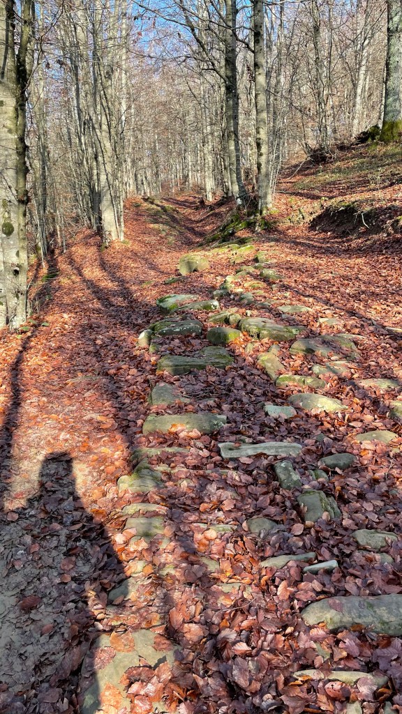 Cinque ore e qualche pausa sui prati. La prima parte era di quaranta minuti con salite ripidissime e poi una bellissima passeggiata tra vecchie strade romane, prati, laghetti e un panorama mozzafiato. Spettacolare. Lo zaino sempre più leggero e io sempre più in armonia con la natura. Le emozioni sono state molto forti, intense. Io e il bosco deserto, solo cinguettii e il rumore dei miei passi sulle foglie a terra.