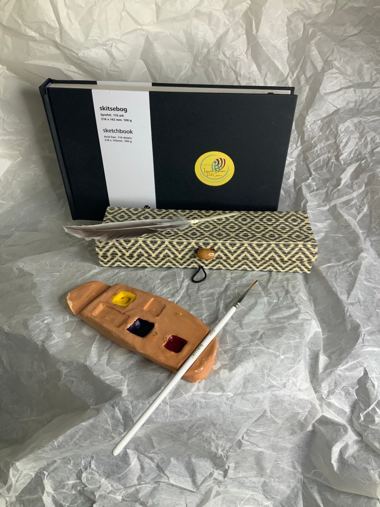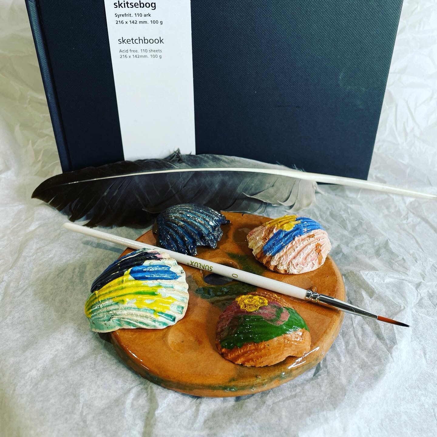 Palette in ceramica con tre colori, pastiglie di pigmenti pregiati.