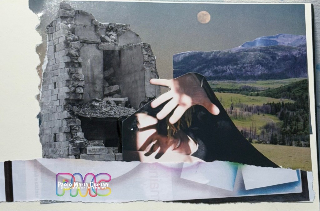 Questo mese è dedicato all’atto di uscire allo scoperto. Come nella meditazione della Luna Piena, il verme risale dalle viscere della terra e si lascia illuminare. Anche il mio collage nasce da quel gesto: ho usato una mia vecchia foto — sì, ho avuto il coraggio di ritagliarla e trasformarla — ma puoi farlo anche con una semplice fotocopia. Attorno ho raccolto immagini da riviste: da un lato i ruderi, dall’altro la natura viva. La luna illumina tutto, perché anche ciò che fa male può essere portato alla luce e trasformato.