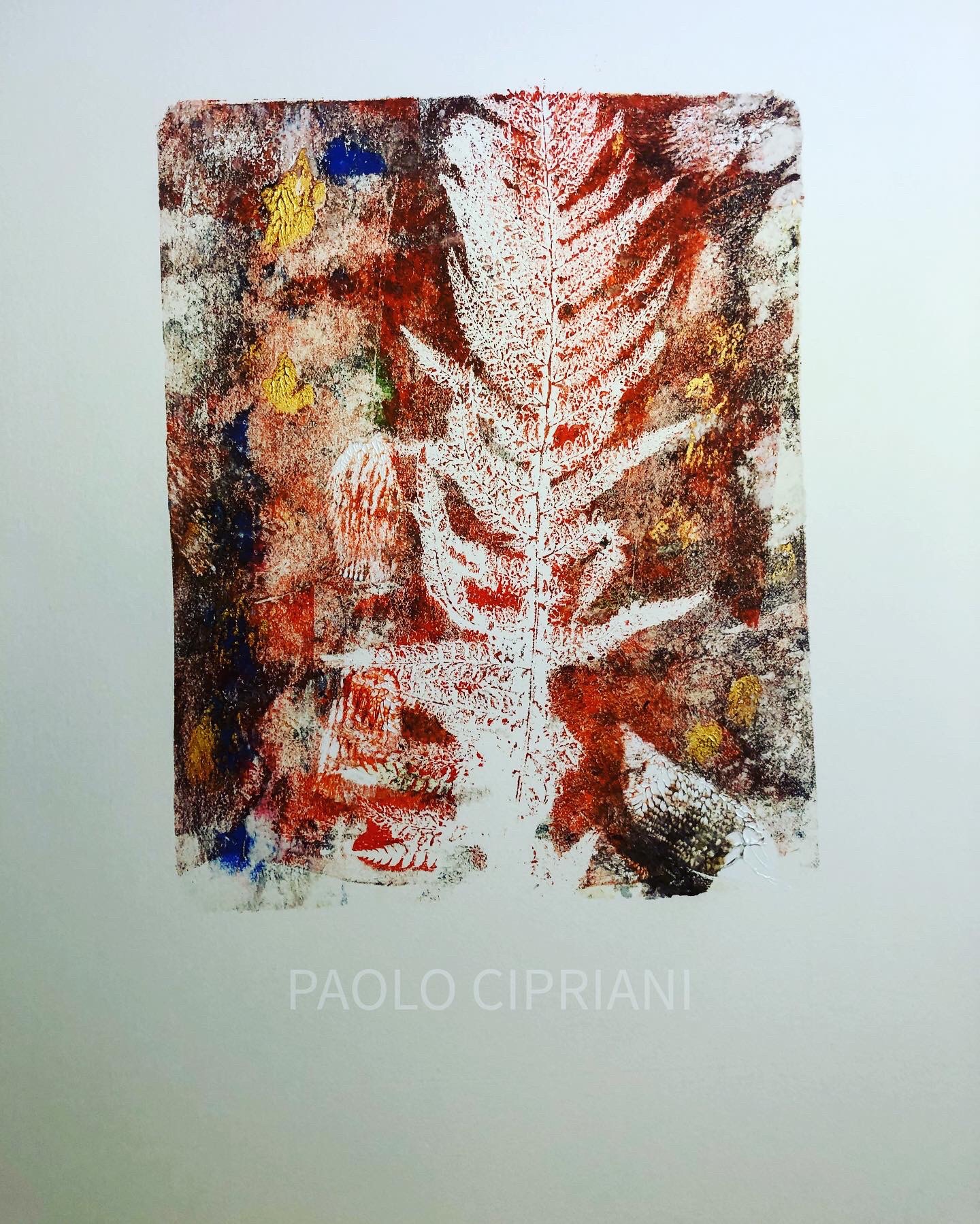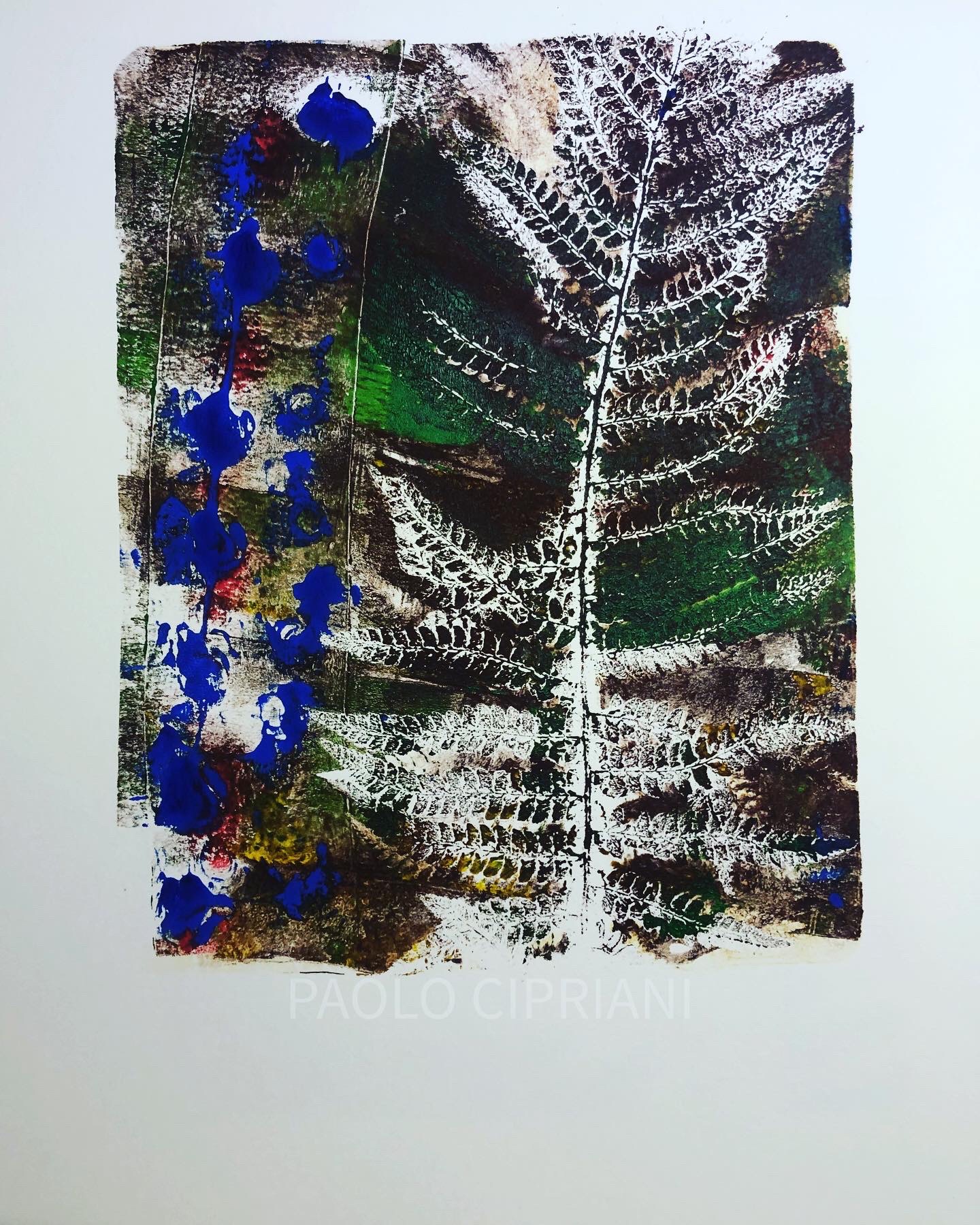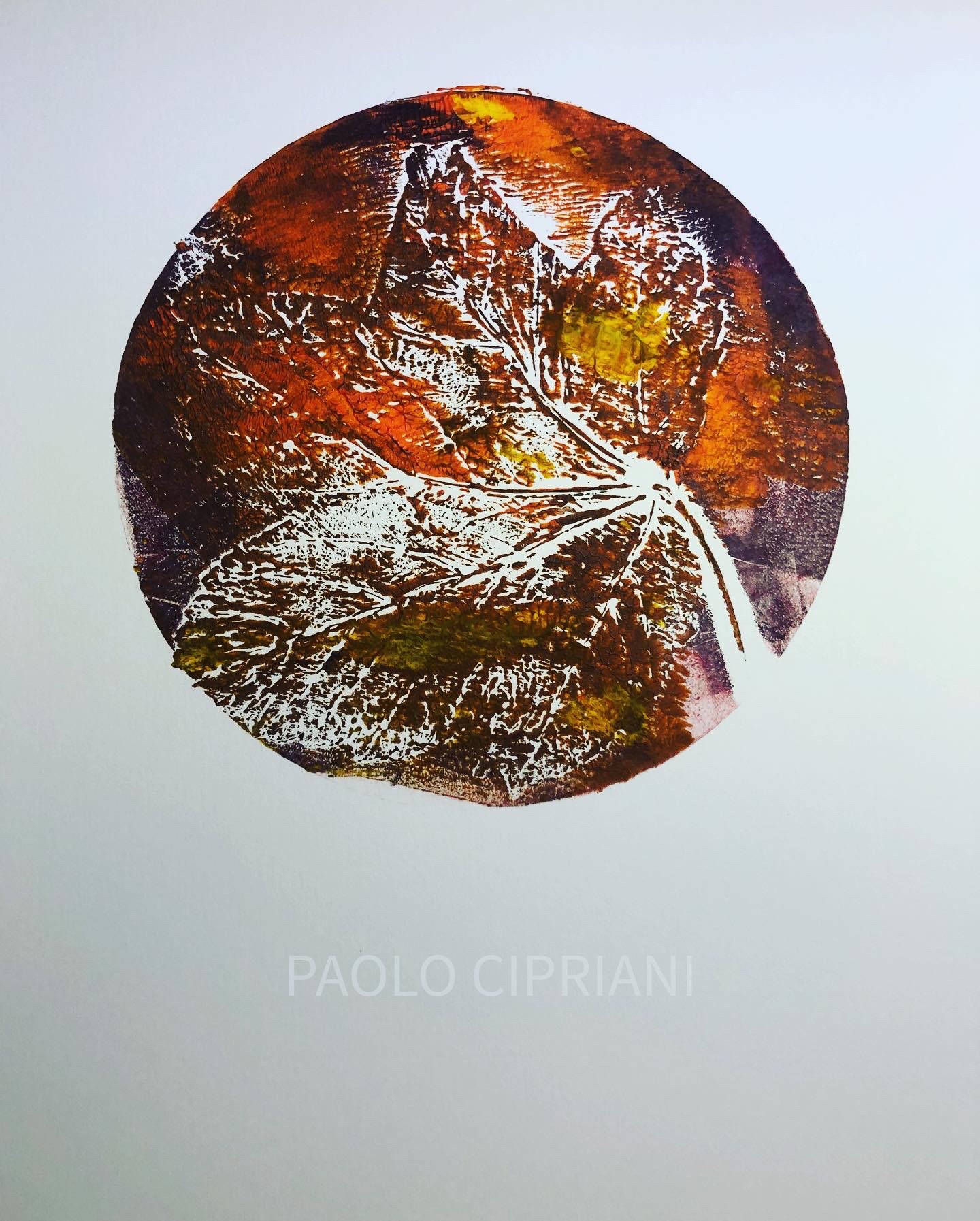 Continua la ricerca, sperimentando nuove forme e nuovi colori. La linea centrale di quest’opera l’ho ortenuta pressando una foglia di porro.