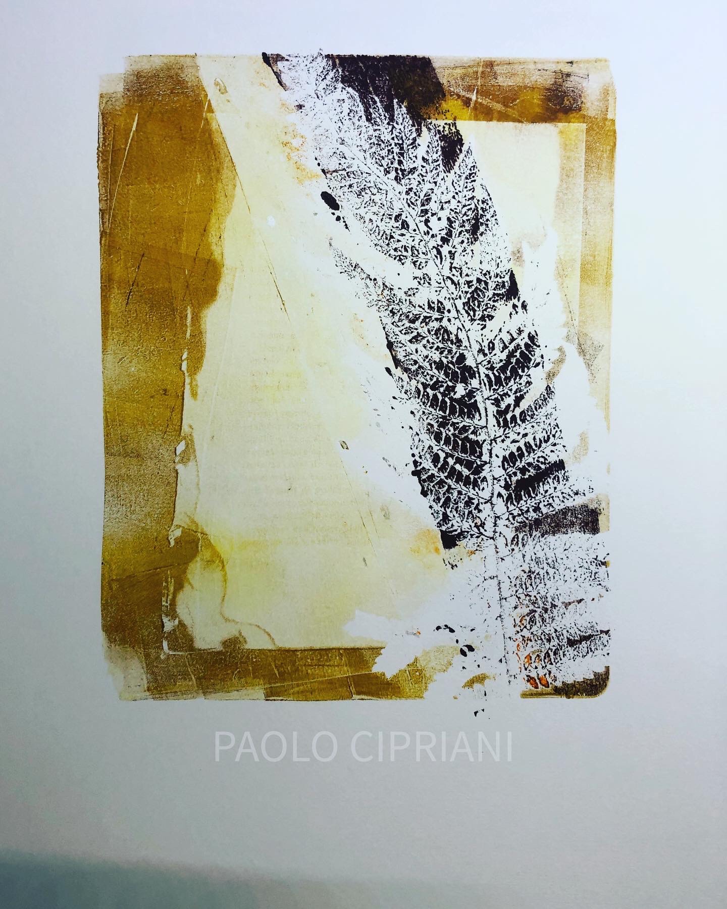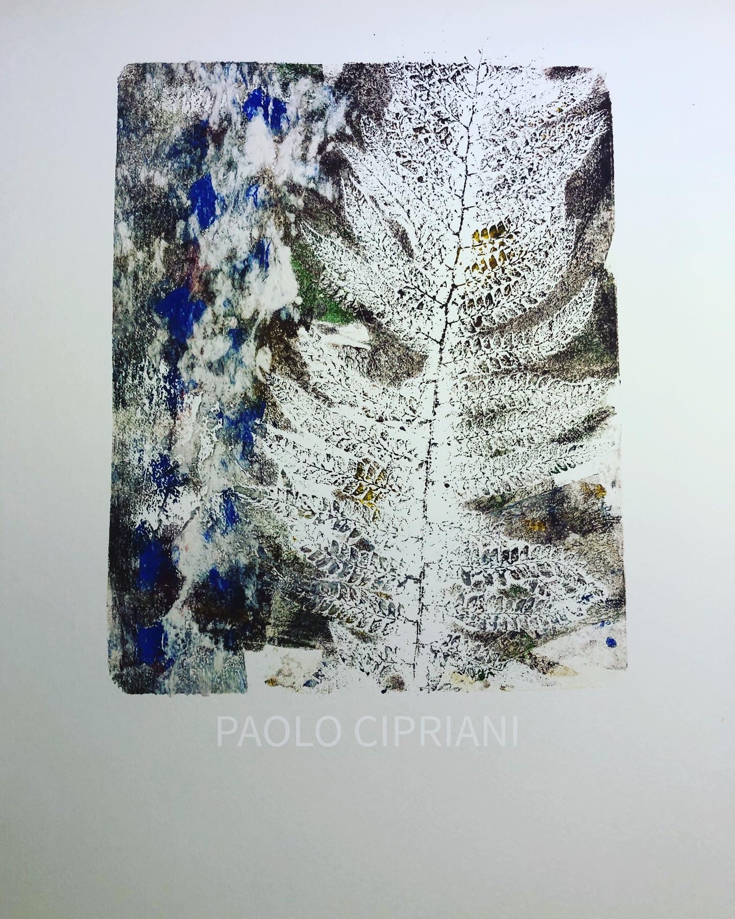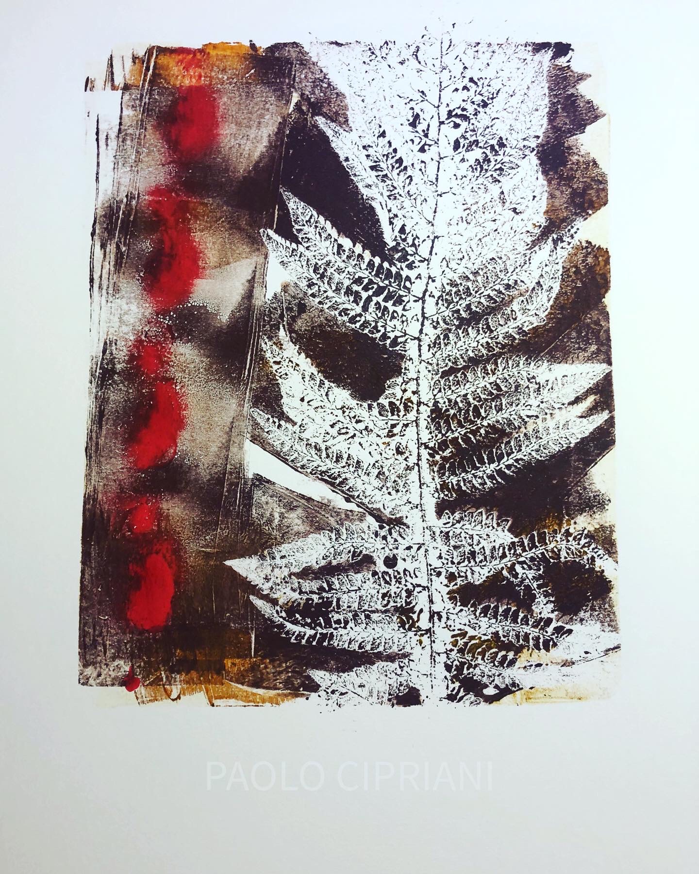Continua la ricerca, sperimentando nuove forme e nuovi colori. La linea centrale di quest’opera l’ho ortenuta pressando una foglia di porro.